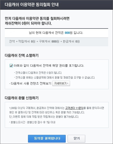 또는 로그인 후 다음캐쉬 이용약관 하단의 '동의를 철회합니다' 버튼을 클릭하여 아래와 같이 팝업되는