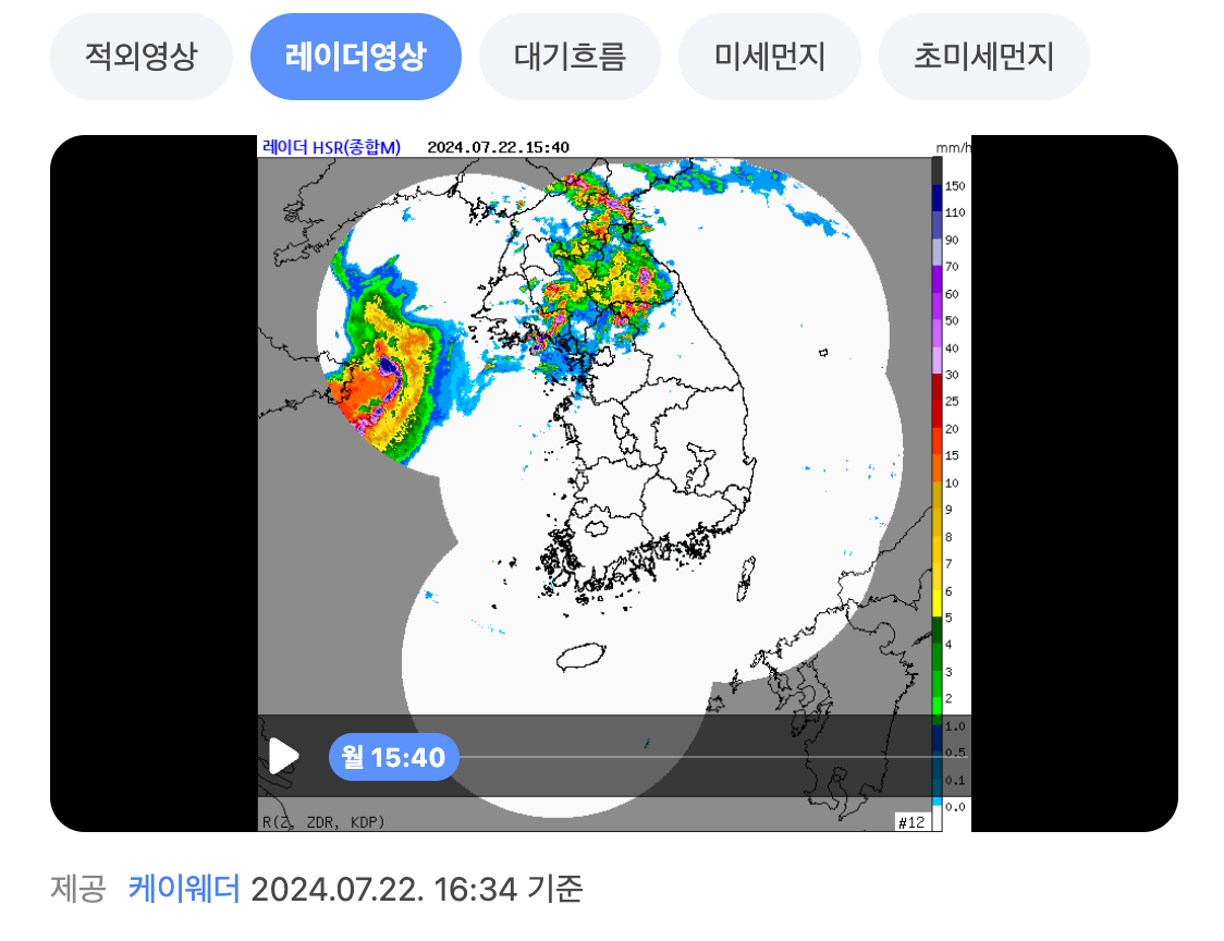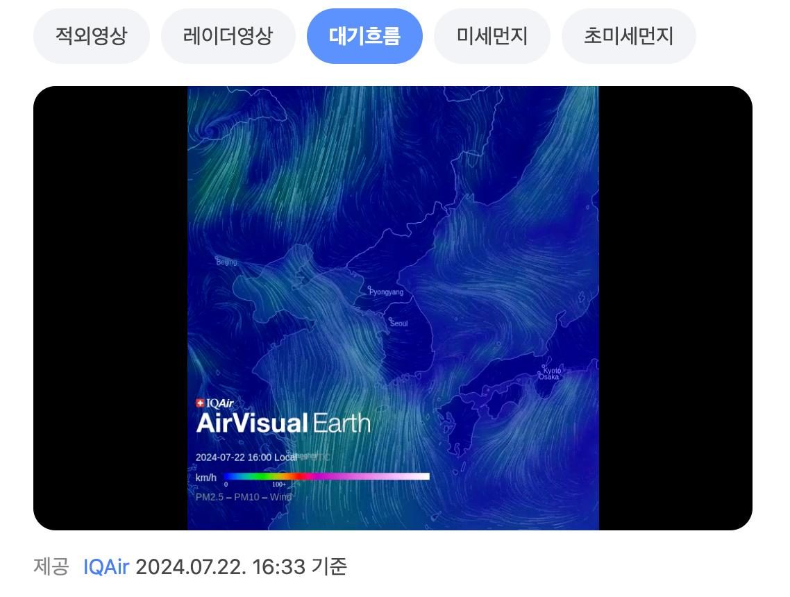 기상청-케이웨더와 IQAir로 부터 제공받은 적외영상, 레이더영상, 대기흐름, 미세먼지, 초미세먼지 5종의 기상 영상을 제공합니다.