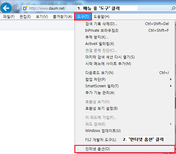 1. Internet Explorer 상단 메뉴에서 "도구"를 클릭하고, 하단의 "인터넷 옵션"을 클릭합니다.