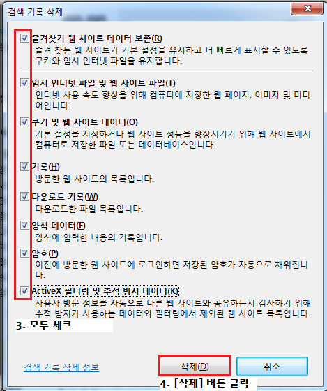 ③ '검색 기록 삭제' 창이 뜨면, 모든 체크박스에 체크를 합니다.