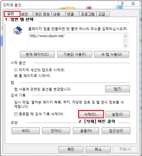 2. 임시 인터넷 파일 및 쿠키를 삭제합니다.