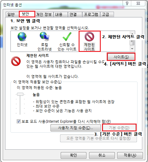 ① 도구 → 인터넷 옵션 → 보안 탭 클릭