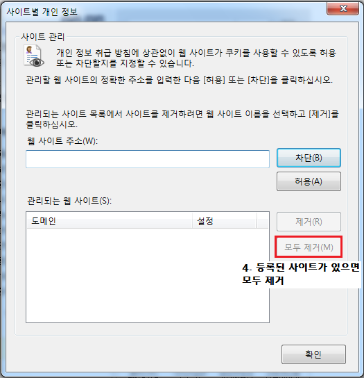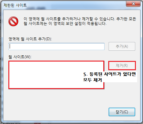 ⑤ 등록된 사이트가 있다면, 모두 제거해 주세요.