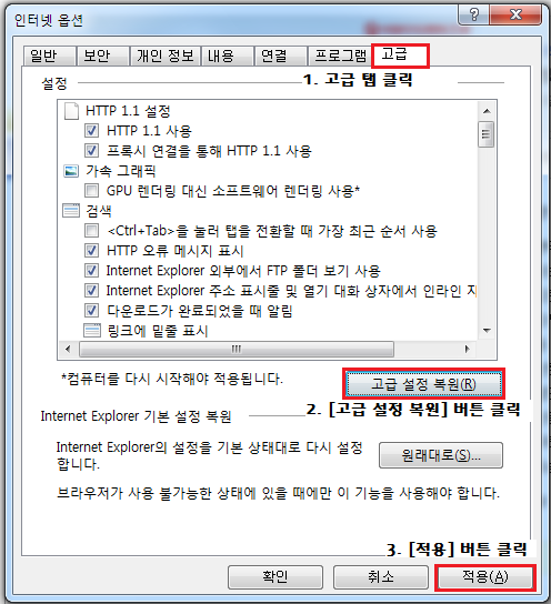 ① 도구 → 인터넷 옵션 → 고급 탭 클릭