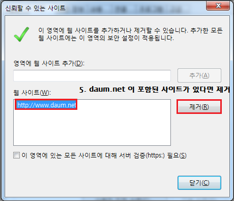 ⑤ '신뢰할 수 있는 사이트' 창이 뜨면, 웹사이트 목록에 'daum.net'이 포함된 사이트가 있는지 확인하고 제거합니다.