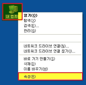 ① 바탕화면의 내 컴퓨터 아이콘에서 마우스 오른쪽을 클릭하여 [속성]을 선택하거나,